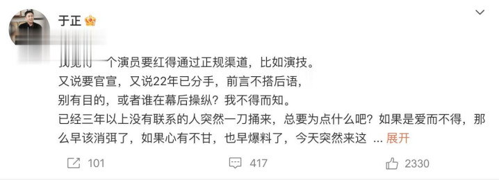于正更是再次发文斥责许荔莎为了“红”而爆料,前言不搭后语,甚至怀疑她背后可能有其他势力操控。