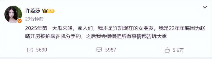 “我是22年年底因为赵晴开房被拍跟许凯分手的,之后我会慢慢把所有事情都告诉大家” 。