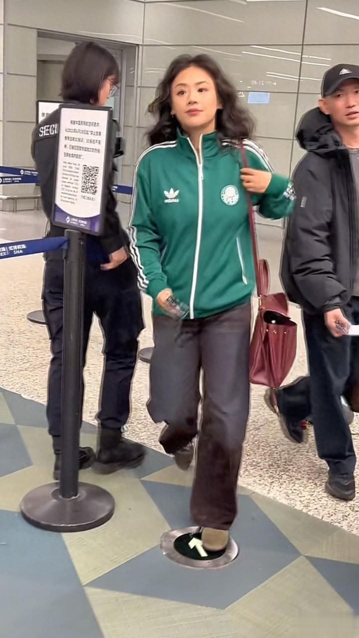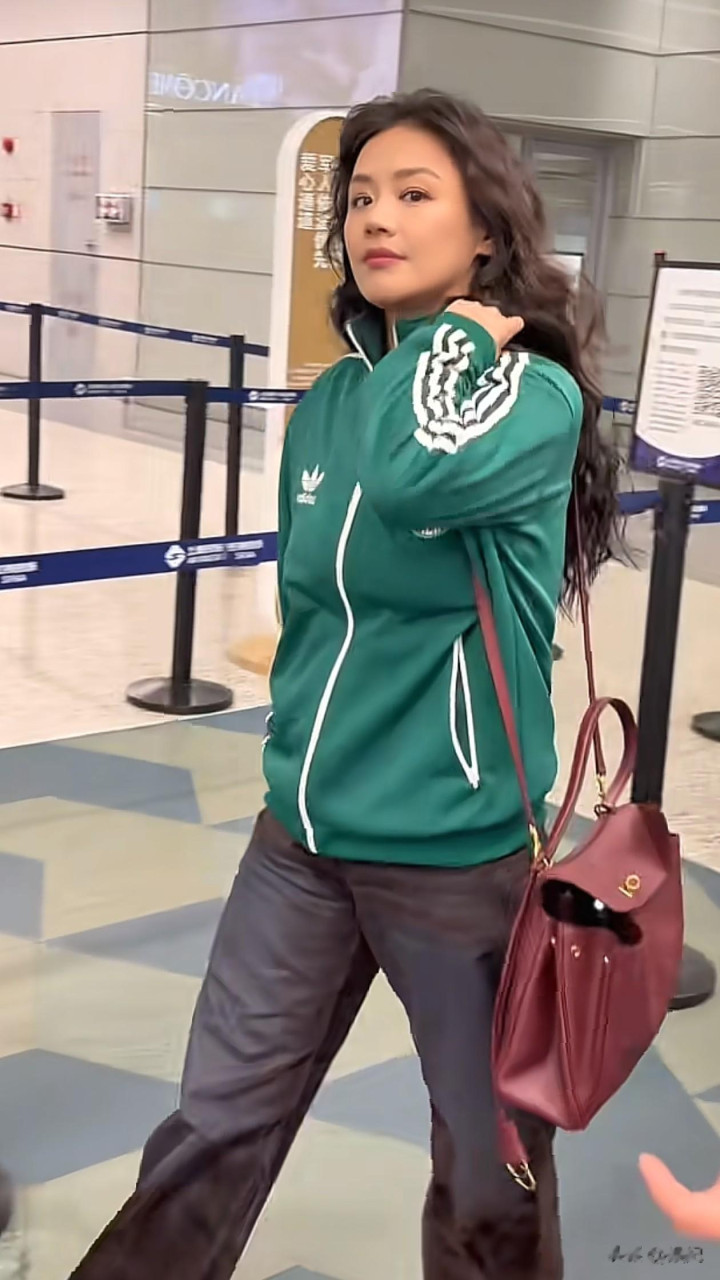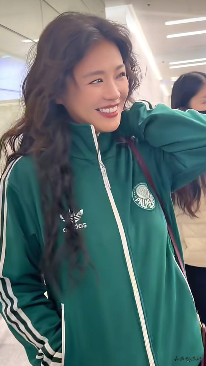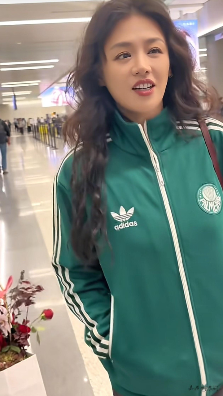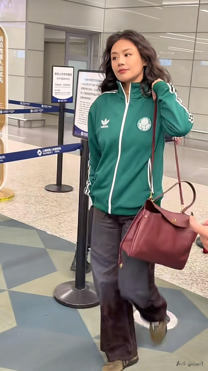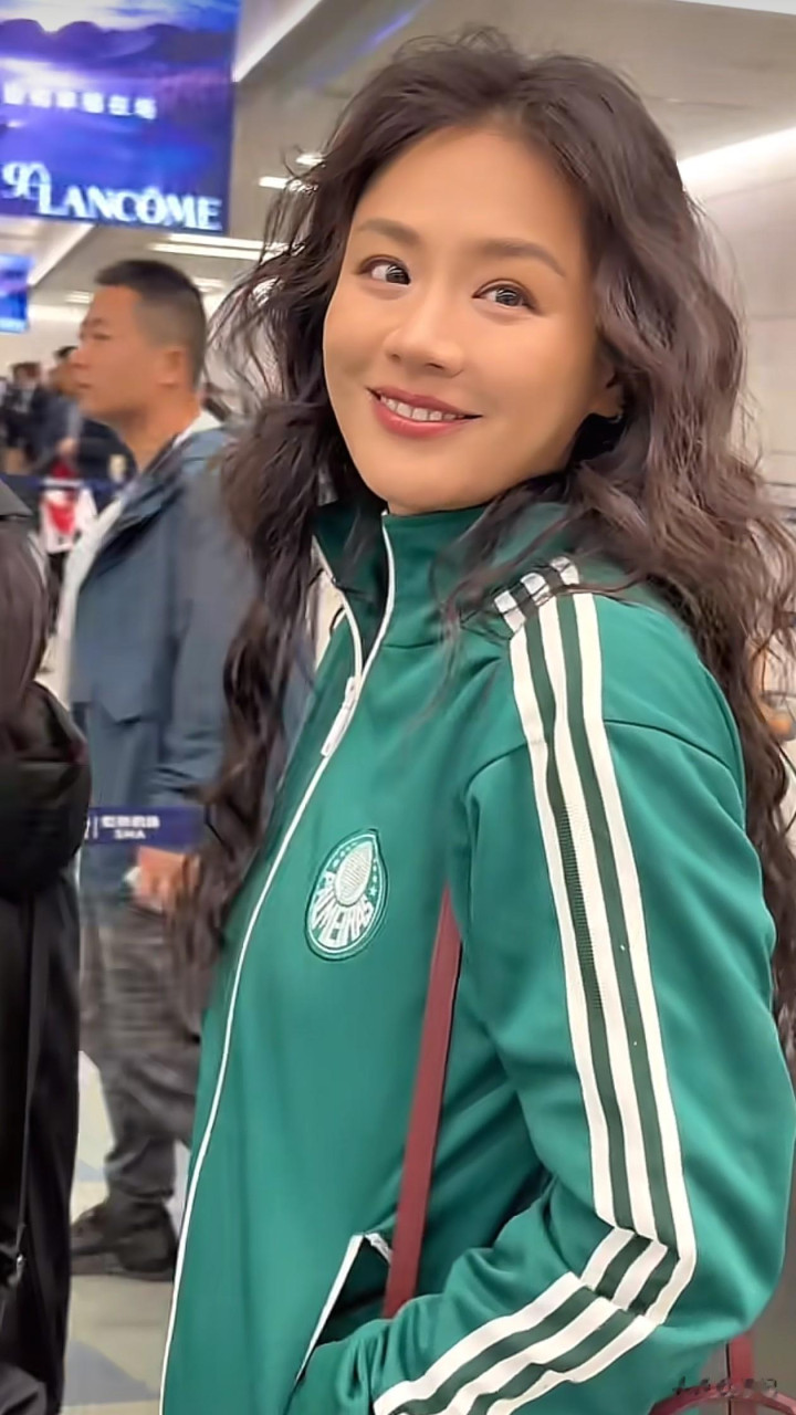 37岁马思纯机场穿搭: 微卷发+夹克外套+阔腿裤, 笑起来好阳光