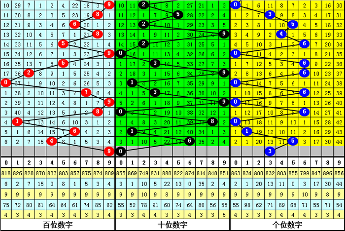 百位分析:该位最近10期开出了4个0路号码、3个1路号码、3个2路号码,0路号码热出。本期排除1路号码,参考号码:9。