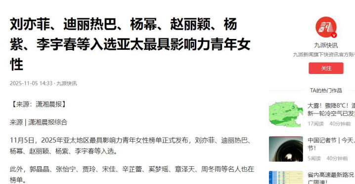 前几天,2025年亚太地区最具影响力青年女性榜单正式发布了。