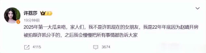 2025年8月22号早上,微博突然炸了。演员许荔莎发长文说:“我不是许凯现在的女朋友,我们2022年底因为赵晴开房被拍分手了。”这话一出,所有人都懵了。原来许凯新剧刚开播,这瓜来得猝不及防。许荔莎还提到自己账号被扒,聊天记录被曝光,但她直接甩锅说许凯现在单身,要慢慢把事说清楚。