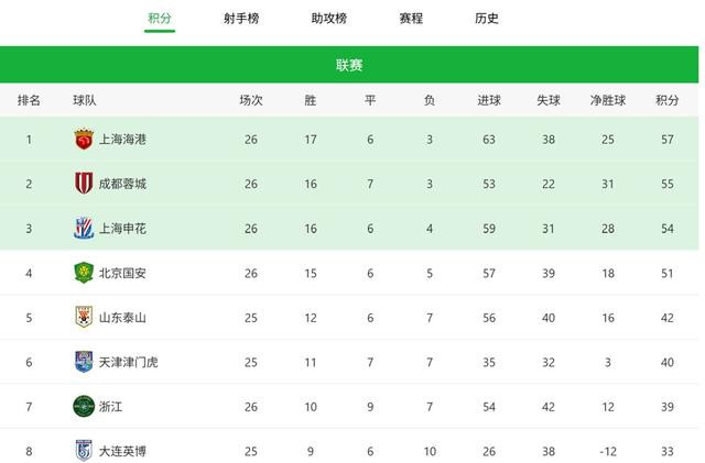 中超第26轮后暂时的积分榜。
