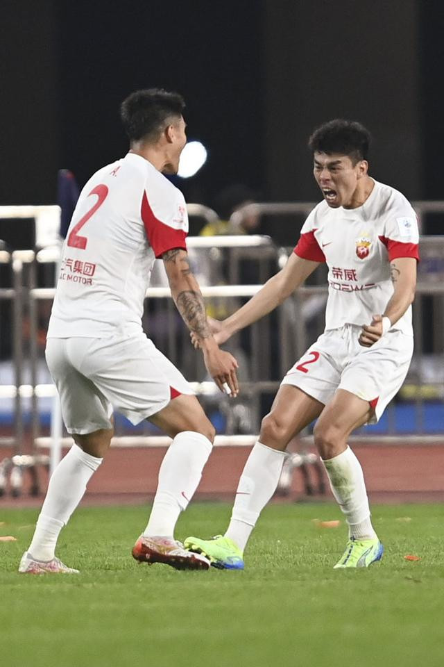 2024年11月23日,上海海港队球员李帅(右)庆祝进球。当日,在浙江温州奥体中心体育场举行的2024赛季中国足球协会杯决赛中,上海海港队3比1战胜山东泰山队,获得冠军。新华社记者黄宗治摄