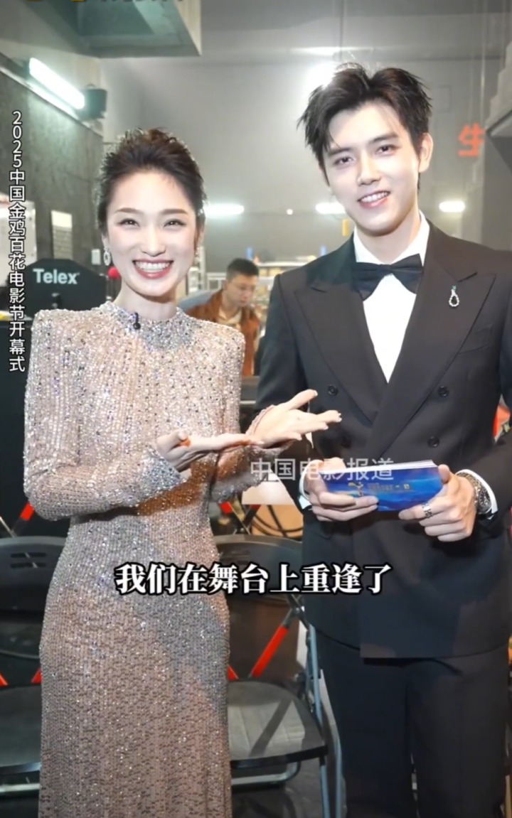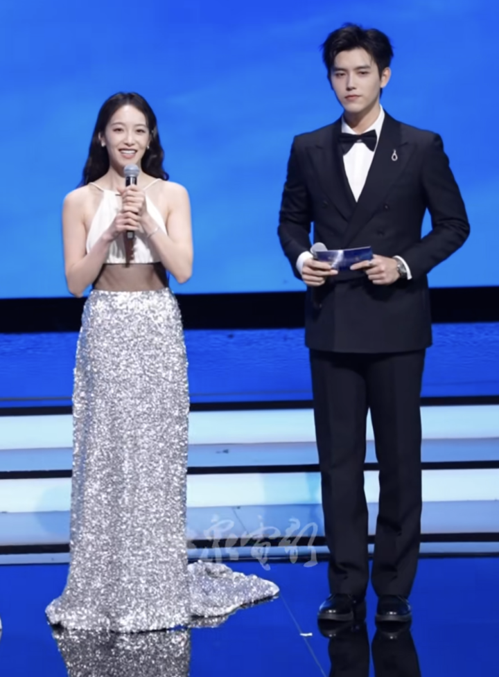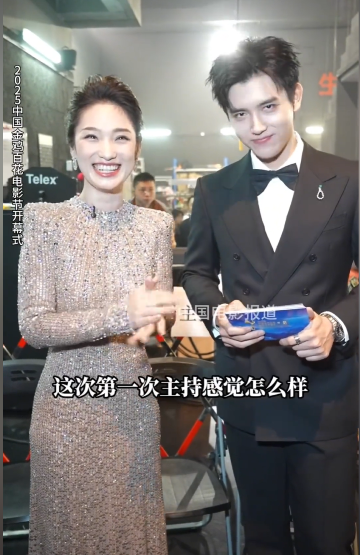 周冬雨与黄渤一同点亮金鸡,两人都是一身黑,庄重而严肃。