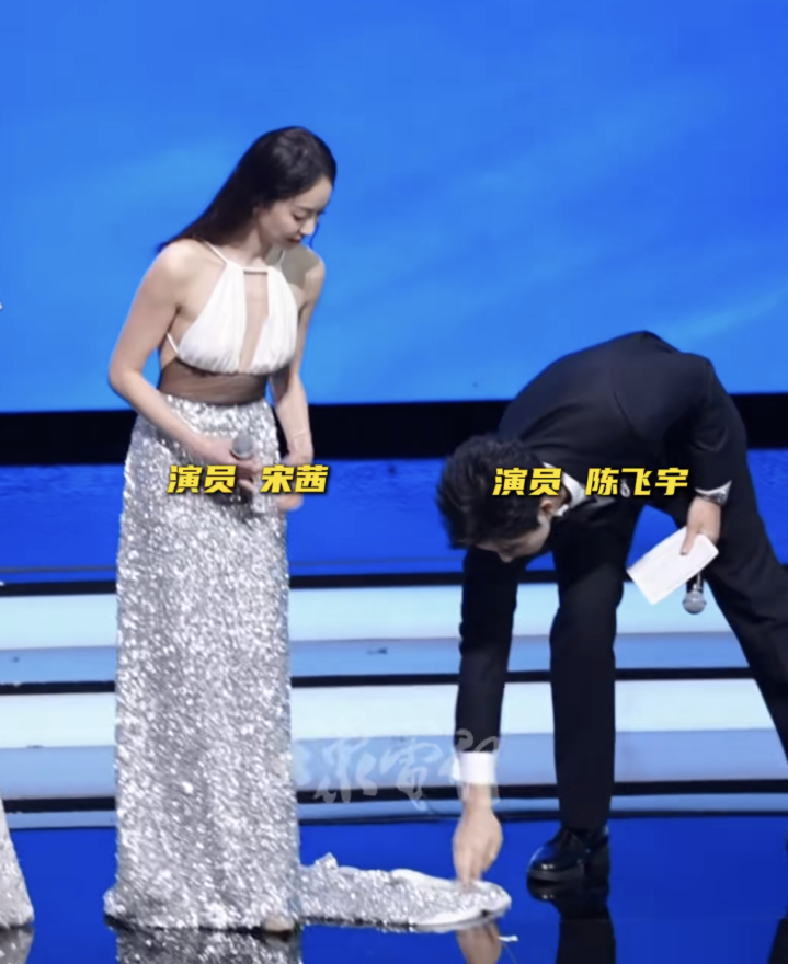 与她同时被受聘为“厦门推介人”的陈飞宇,在她上台时非常贴心地帮她整理裙摆,很绅士。