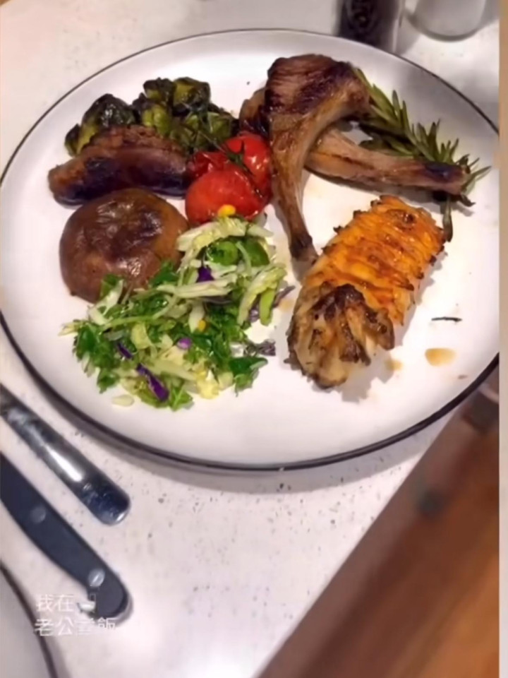 艾伦为陈乔恩烹饪西餐,有羊排、、西红柿、青菜、以及澳洲特有的大蘑菇,红绿相间、荤素搭配,色泽漂亮让人看了就很有食欲。